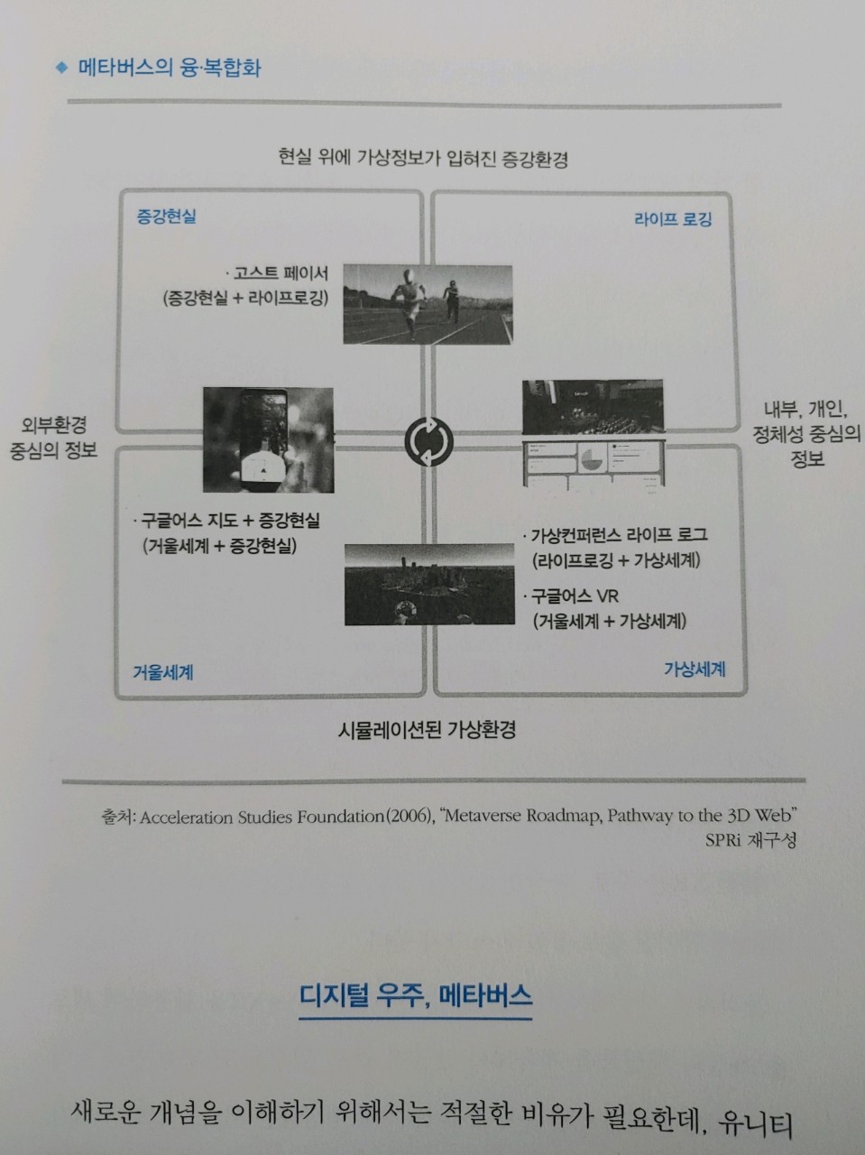 메타버스가 오고 있다. 메타버스는 메타(Meta, 초월) + 유니버스(Universe, 세상)의 합성어로 <스노우 크래시>라는 소설에서 처음사용되어 지금까지 널리 사용되는 용어가 되었다. 메타버스는 증강현실, 라이프 로깅, 거울세계(미러월드), 가상세계가 융합되어 나타나는 현상을 말한다.