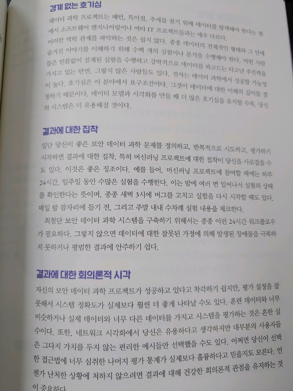 이 책의 말미에 보안 데이터 과학자로 살아가는 것에 대한 조언 중에서 결과에 대한 회의론적 시각이라는 말에서 많은 고민들이 느껴지는 순간이었다.