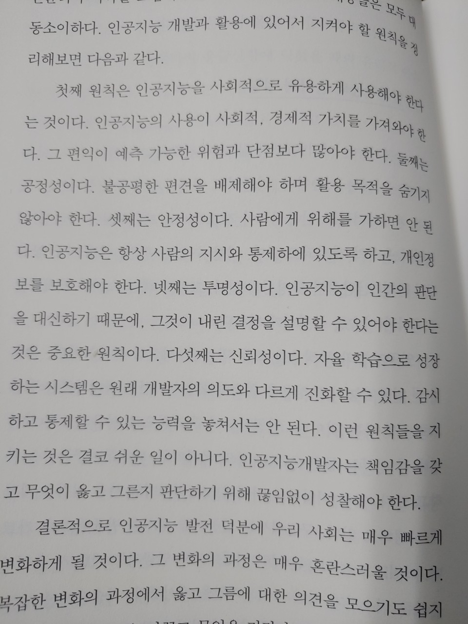 아직 인공지능 기술은 갈길이 먼 기술인 것 같다. 하지만 많은 영역에서 빠르게 자리잡아 가는 것도 사실이다. 이 기술에 대해 우리가 깊은 고민없이 받아드리게 된다면 인공지능에게 종속되어 이성적 능력이 퇴화되는 시대가 올지 모른다는 저자의 우려가 가볍게 들리지 않는다.