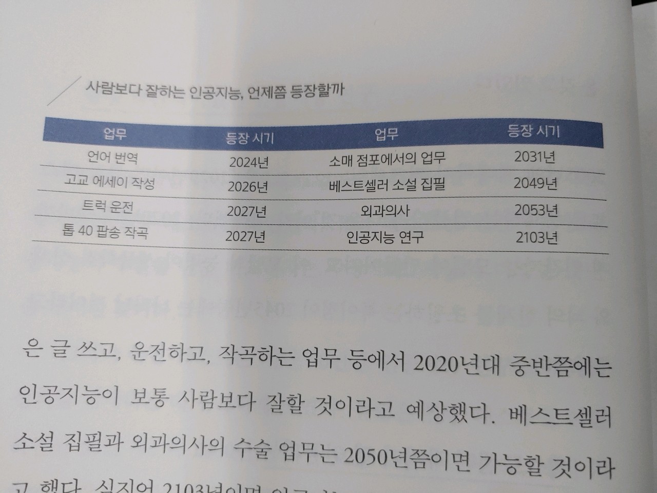 결국 지식을 나열하는 것이 아닌 인간 간의 관계나 인간의 감성과 같이 인간이 가지는 고유한 특성을 살릴수 있는 직업들이 살아남게 될 것이지만 인공지능 기술이 직접 접목되는 분야는 고소득 직군으로 남아 책의 표현대로 슈퍼노동자로 탈바꿈하게 될지도 모르겠다.