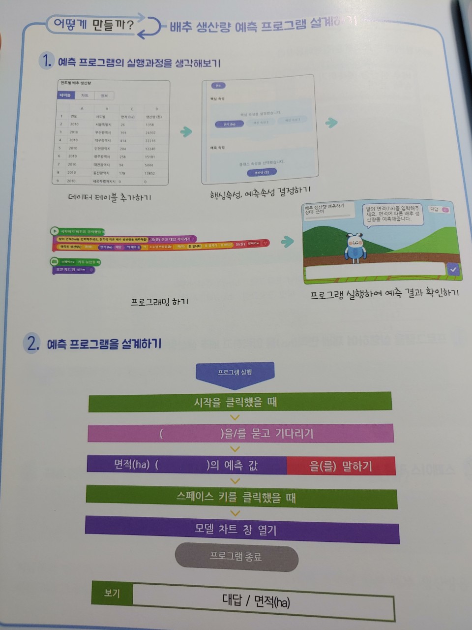 책은 크게 세부분은 구성되어있는데 1부는 구글어시스턴트나 티처블머신같은 인공지능을 쉽게 접하고 이해하기 쉽게 구성되어있는 서비스를 중심으로 인공지능 기술에 대해 체험하는 방식으로 구성되어 있고 2부는 언플러그드를 이용한 인공지능이라는 제목으로 직접 손으로 만들어서 놀이처럼 인공지능 학습원리를 이해하도록 구성되어있다. 3부는 엔트리를 이용해 음성인식이나 쳇봇, 붓꽃 판별기, 배추 생산량 예측과 같은 내용을 직접 프로그램으로 구성하면서 체험할 수 있게 구성되어있다.