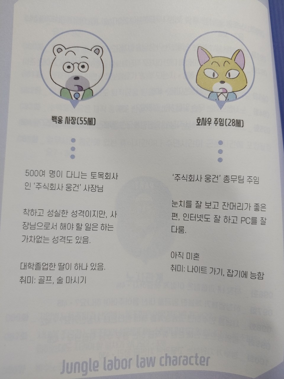 동물 캐릭터를 이용해 한페이지씩 노무관리와 관련된 다양한 상황을 만화로 표현한 다음 2~3페이지씩 그 상황에 맞는 법률적 근거와 해설들을 진행하는 방식으로 구성되어있다.
