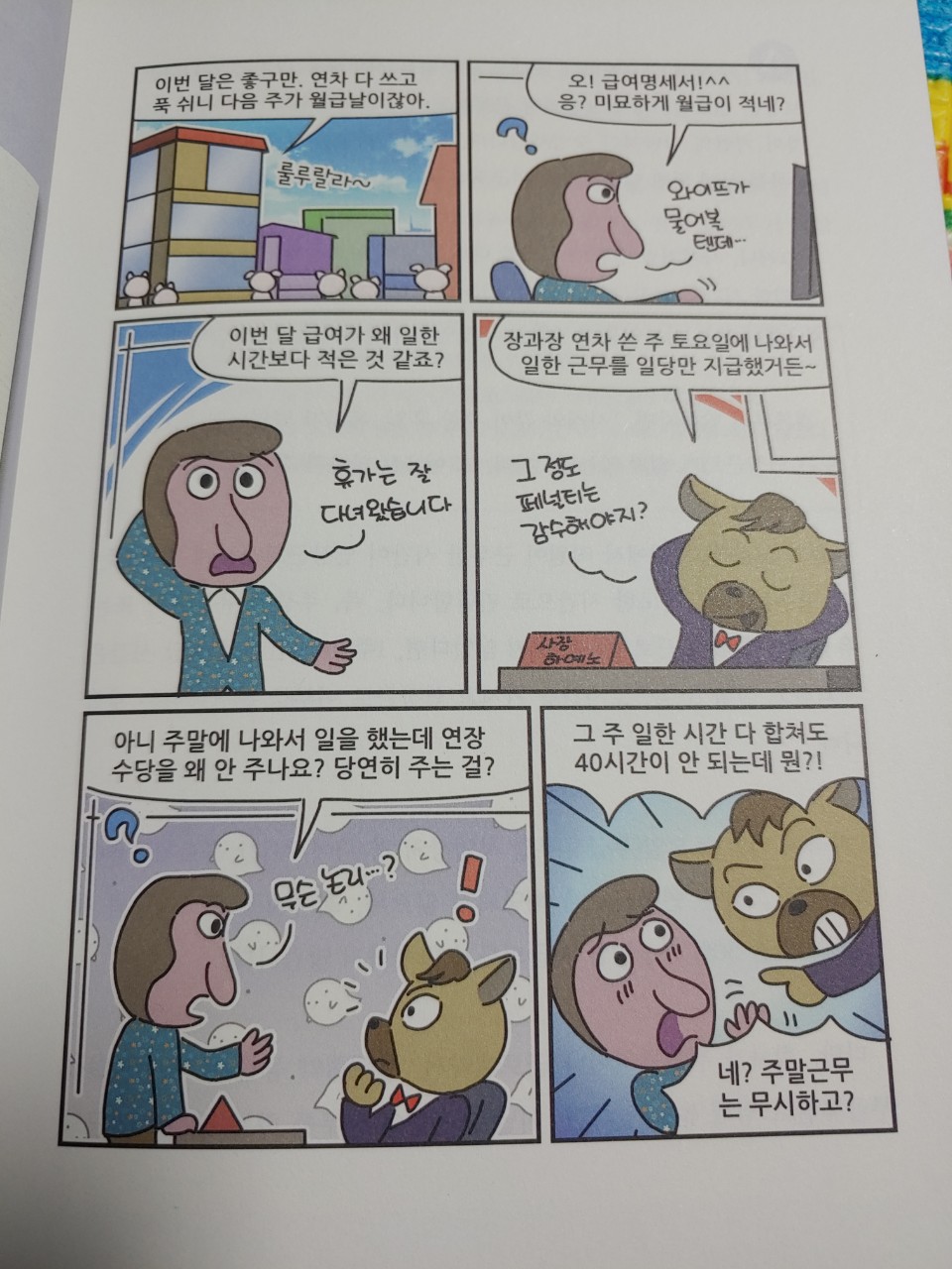 만화가 정말 이해하기 쉽게 상황을 잘그려서 보여주는데 변호사이자 만화가로 활동한다는 그림 작가는 정말 상황에 대해 높은 이해를 가지고 있다는 생각이 들었다. 그리고, 주로 고용주들은 육식동물이나 사납고 거친 곰, 사자, 상어 등으로 표현되고 직원들은 토끼, 붕어 등인 초식동물이거나 상대적으로 순하고 약한 동물들로 묘사된 것은 조금은 씁쓸한 면이기도 했다.