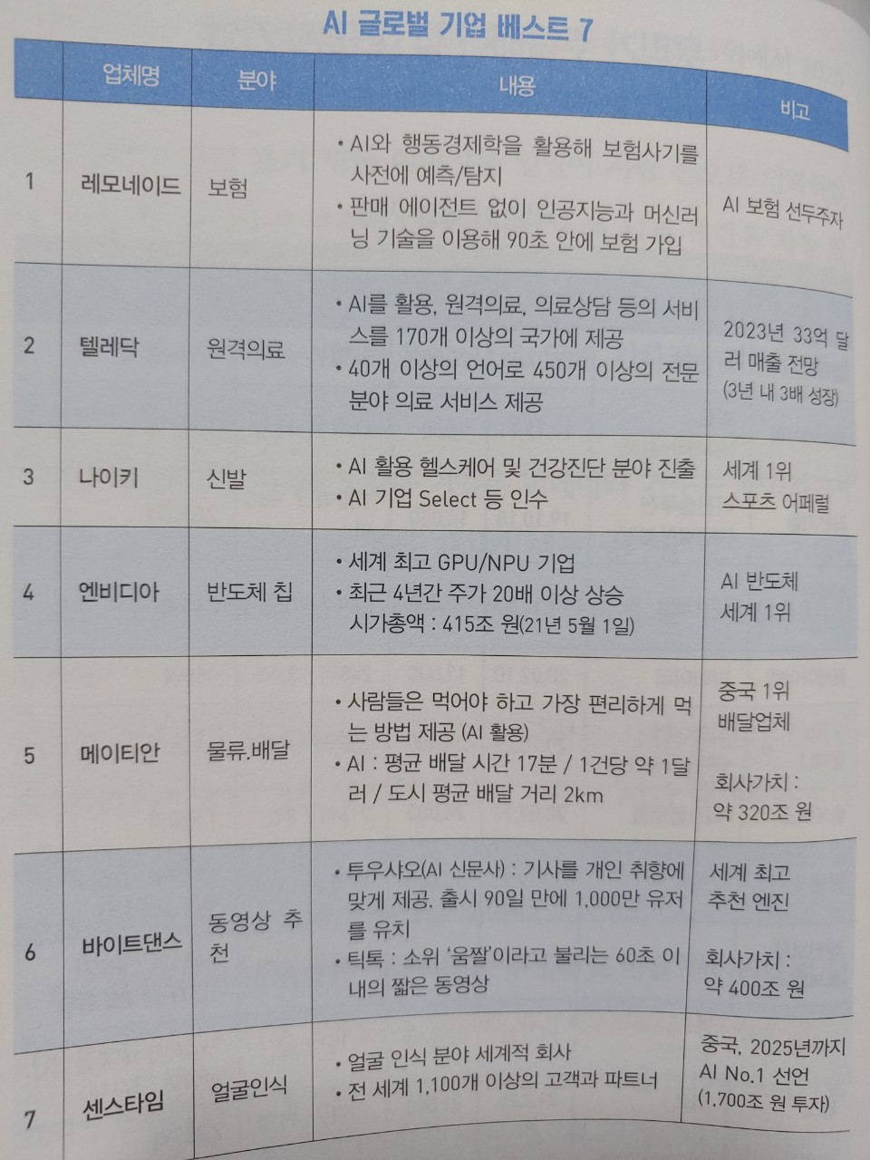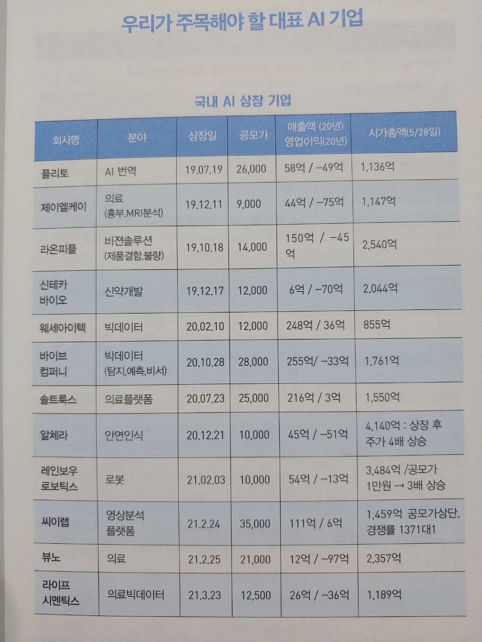 그러면서 AI와 연관된 분야를 하나씩 점검하며 어느 기업이 그 분야에서 두각을 나타내고 있는 지 꼼꼼히 살펴서 설명해 준다. 직접 기업의 대표와 인터뷰하고 대표의 이력이나 약력은 물론이고 기업이 걸어온 발자취나 설립배경까지 전문가 다운 안목으로 기업 하나하나의 면면을 찬찬히 살펴주니 내가 어느 기업에 관심을 가져야 할지 주목하게 된다.