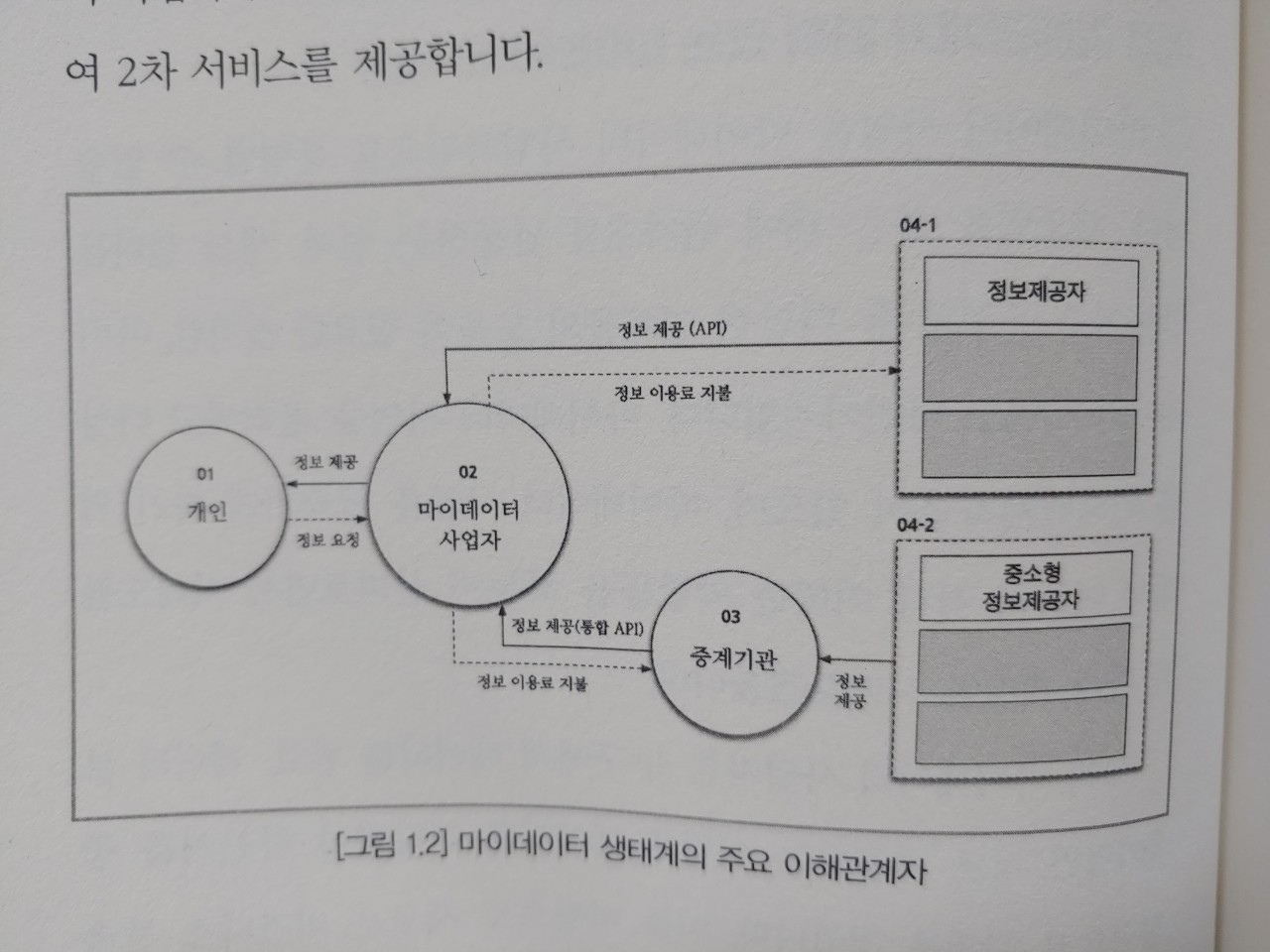 가장 쉬운 예가 내가 자주 가는 스타벅스의 라이프 스타일을 카드사에 제공하고 제공받은 카드사는 고객의 라이프 스타일을 기준으로 스타벅스에 나에게 맞는 맞춤형 데이터를 제공할 수 있게 해주는 데이터 연계 서비스이며 그 정보 제공의 주체를 개인에게 부여함으로써 서비스에 대한 책임에서 기업의 부담을 덜고 개인이 선택적으로 자신의 데이터를 폭넓게 활용할 수 있는 기반을 만드는 것이라고 이해된다.