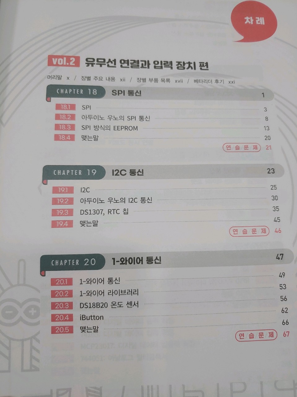 내가 본 2권의 내용은 유무선 연결과 입력장치에 대한 내용이 들어있어서 SPI, I2C, 1-와이어 유선통신과 블루투스, 지그비, 적외선 통신, RFID, BLE까지 근거리 무선통신에 대한 내용을 다루고 있고 아두이노 간의 연결에 대한 여러가지 방식들을 소개하고 있다.