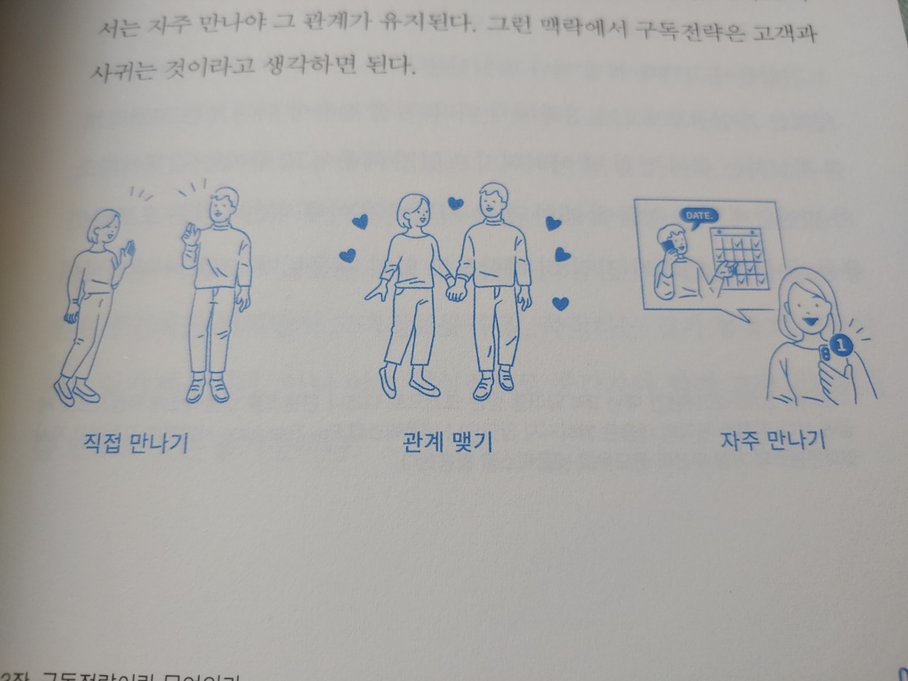 저자는 구독에 대한 개념을 크게 3가지로 구분해서 성공적인 구독을 위해서는 직접만나고 관계를 맺고 자주 만나야 한다는 것을 이야기하고 있다. 즉 직접 만난다는 것이 오프라인 만남만을 의미하는 것이 아니라는 이야기다.