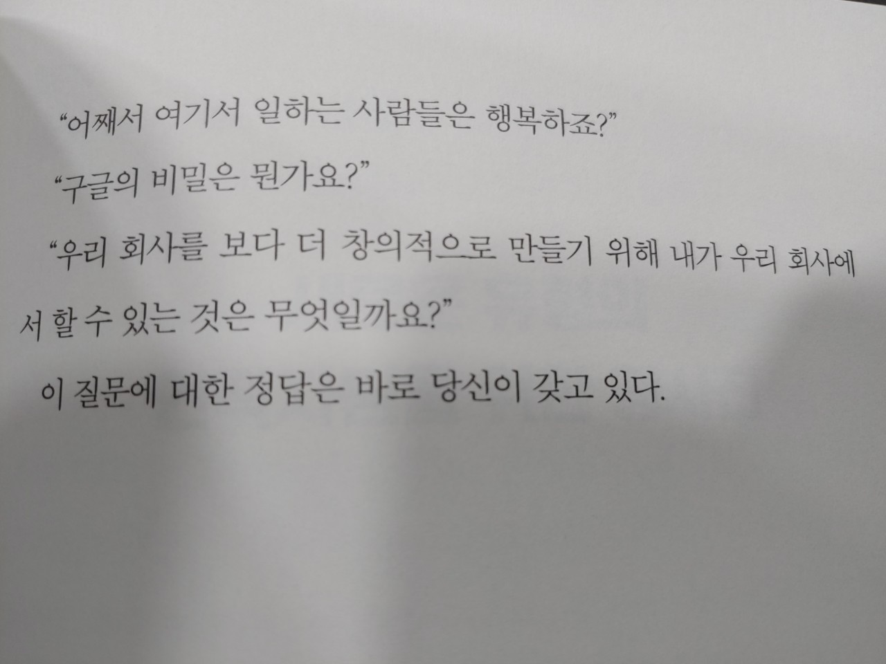 구글은 그런 회사를 만들기 위해 많은 노력과 실험을 반복해왔고 지금도 끊임없는 노력을 기울이고 있다고 말한다.
