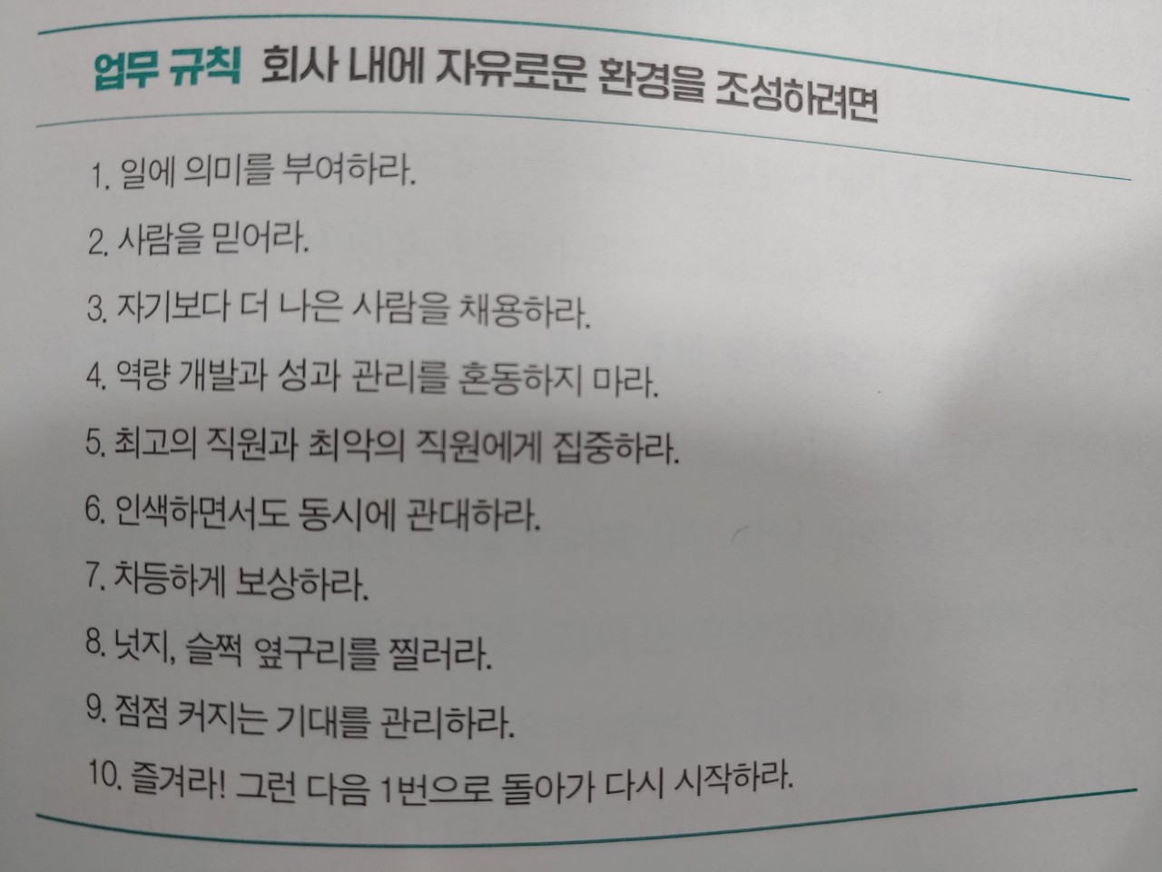 한마디로 자유와 책임이다. 신뢰와 인정이나 긍정과 투명함와 같은 몇몇 단어로 교체해도 되는 개념들일 수도 있다.