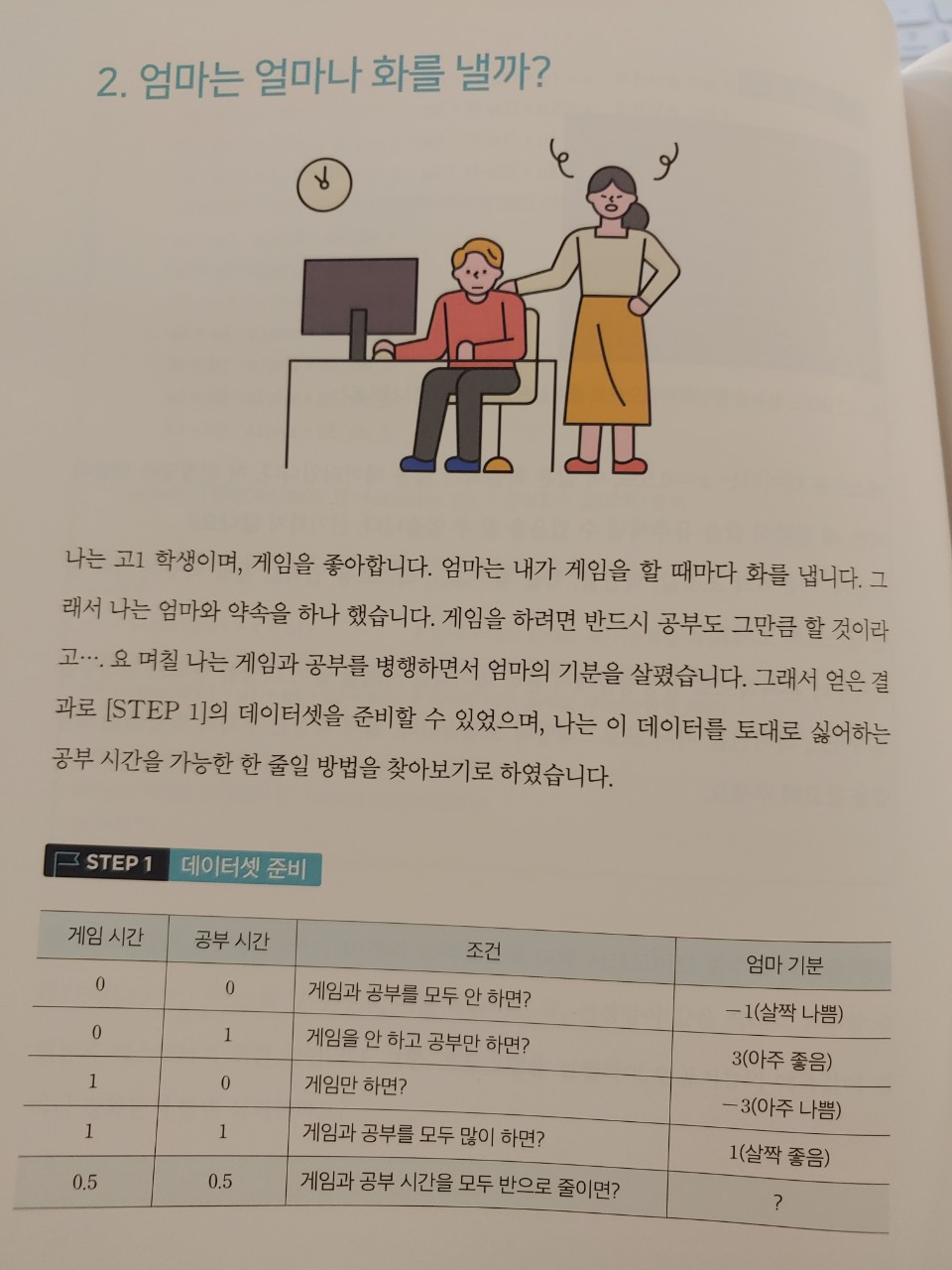 거기에 "엄마는 얼마나 화를 낼까?" 같은 재미나고 다양한 사례를 통해 해당 사례를 분석하기 위해 데이터셋을 어떻게 준비해서 실제 모델을 어떻게 만들고 그 모델에 대한 손실함수를 설정하는 방법과 출력값을 계산하기 위한 실제 함수를 만들고 경사하강법과 오차역전파법을 적용하는 방식까지 모든 과정을 하나하나 수식과 코드로 풀어서 설명해주고 있다.