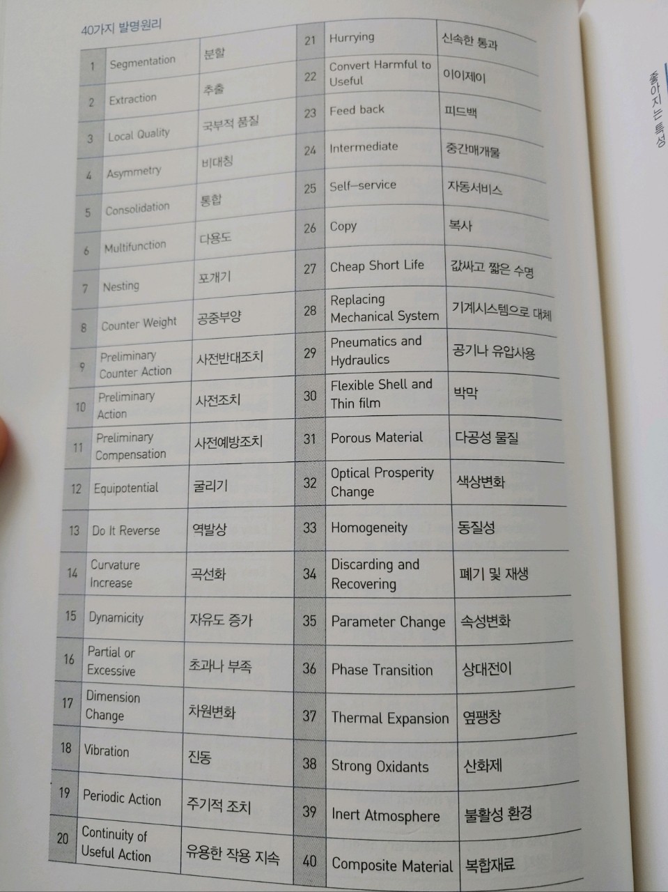 특허는 아이디어를 구체화하는 과정이다. 이 책에서도 아이디어를 구체화하는 과정에 대해 자세히 소개하고 있는데 39가지 파라미터나 40가지 발명원리는 구체적이면서도 실제 적용이 어렵지 않은 내용들이라 많은 사람들에게 도움이 될 것 같다.