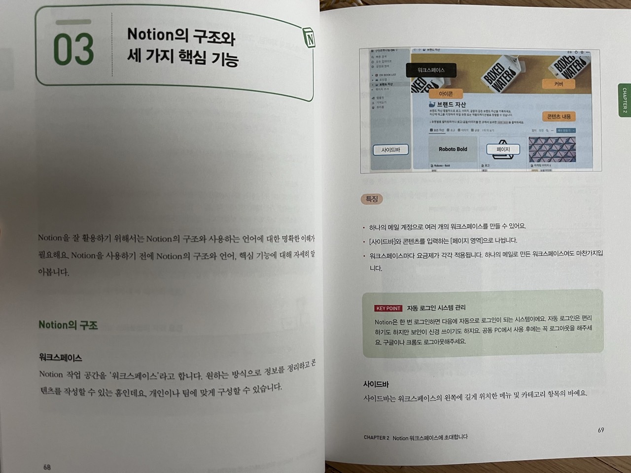 책은 노션이 무엇인지 왜 유용한지에 대한 이야기를 시작으로 노션을 사용해 일과 자신의 생활을 효율적으로 운용할 수 있다는 것을 말한다.