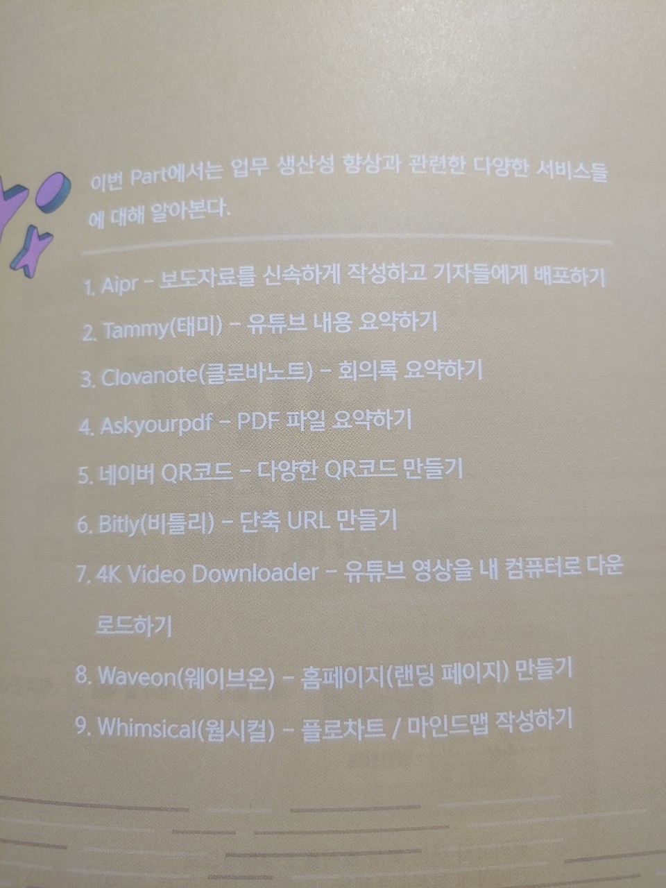 이 책은 업무에서 활용하기 좋은 AI 서비스를 잘 모아서 설명해주고 있는 책이다.
