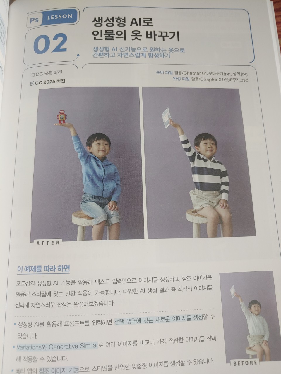 그리고 크게 파트를 나누어서 파트 원은 기능 위주의 내용이라면 파트 투는 활용편으로 최근 포토샵을 더 강력하게 만들어준 생성형 AI를 사용하는 방법이나 SNS 카드뉴스와 같은 트랜디한 디자인 기법은 물론 타이포그래픽까지 이미지를 다양하고 화려하게 구성할 수 있는 다양한 활용팁을 모아두어 하나하나 따라해보고 싶게 만들었다.