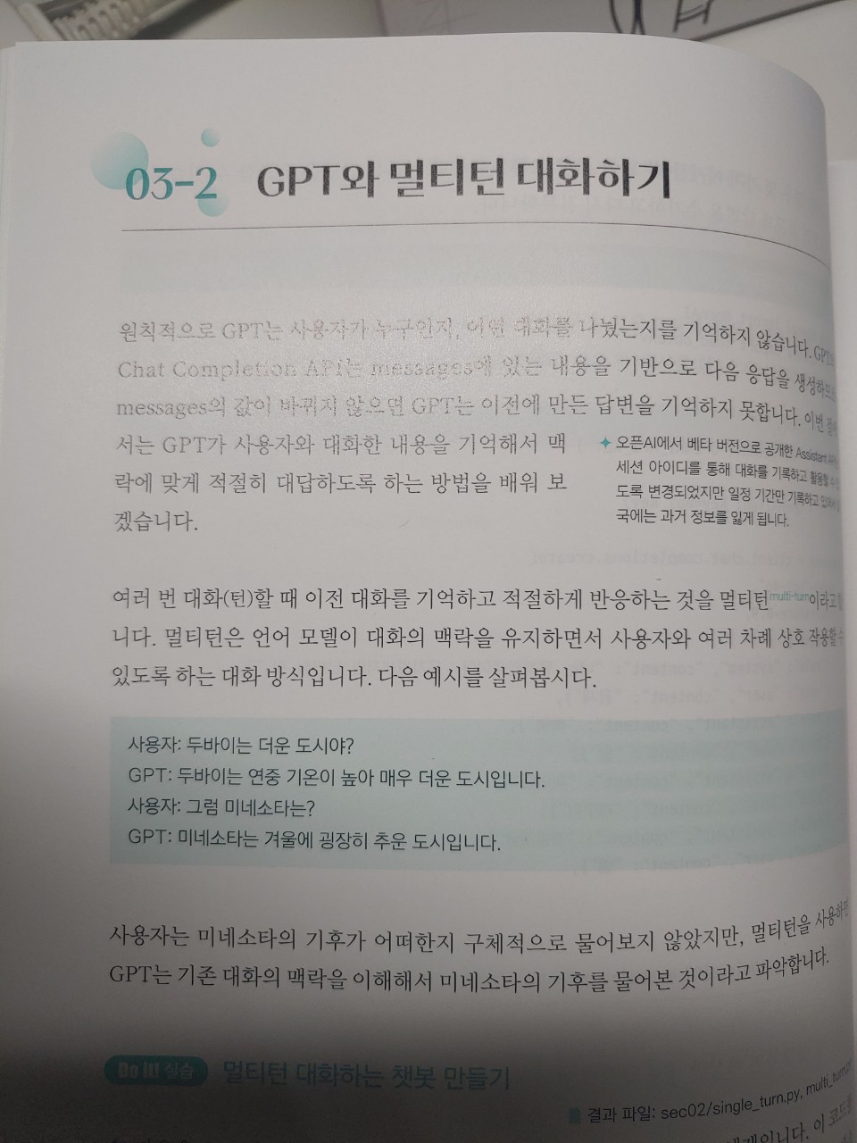 유행하는 다양한 기능들을 나열하기보다는 오픈 AI를 기반으로 GPT API를 활용하는 것을 소개하면서 GPT를 활용하는 멀티턴 대화부터 실제 대화와 함수를 연결해 활용하는 것까지 기존에 알려진 응용에 대해 펼쳐 보여주며 에이전트 구현을 위한 워밍업을 시작한다.