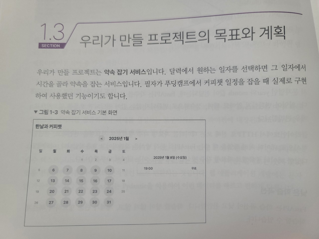 아무래도 웹개발을 위한 책이라서 파이썬 문법에 대한 내용은 따로 없지만 미니 프로젝트 형식으로 캘린더에 약속 일정을 올리는 내용을 책 전반에서 구현하고 있다.